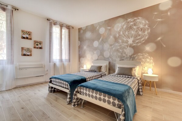 Spacious and bright apartment on the ground floor of a building in the Santa Croce district. This modern apartment offers a living area with a dining room and kitchen, and a living room with a TV and a sofa. The kitchen is fully equipped with everything needed for cooking, including a microwave, dishwasher, kettle, and toaster. White Flowers features two bedrooms, the first furnished with a queen-size bed, and the second with two single beds. The layout is completed by a bathroom with a shower.
