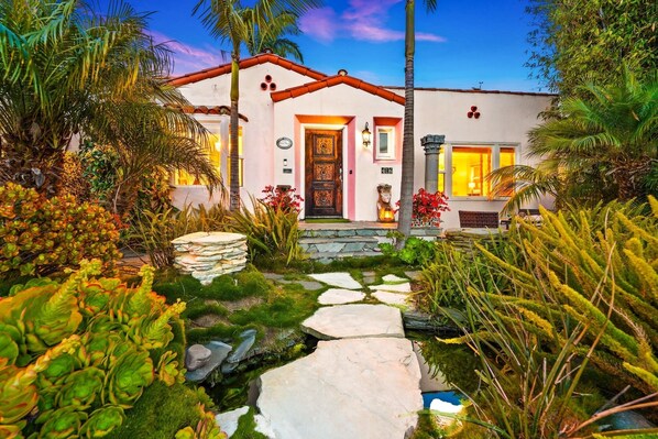 Step outside and enjoy one of the home’s most loved features—the lush backyard. Framed by mature palms and native California plants, the outdoor space feels peaceful and private. Guests love soaking in the hot tub, relaxing under the trees, and gathering around the rustic elements, including an old stone well and a decorative outdoor fireplace that add nostalgic character to the space.