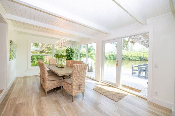 Brand new renovation on an island in the Indian River. The owners have provided everything you could need for relaxing stay including bikes and kayaks. There were still some things unfinished while we were there but the property managers were very responsive. It will be lovely when completely finished. Of note, it is a busy road in either direction to get off the island so biking to the beach was too intimidating for our crowd.