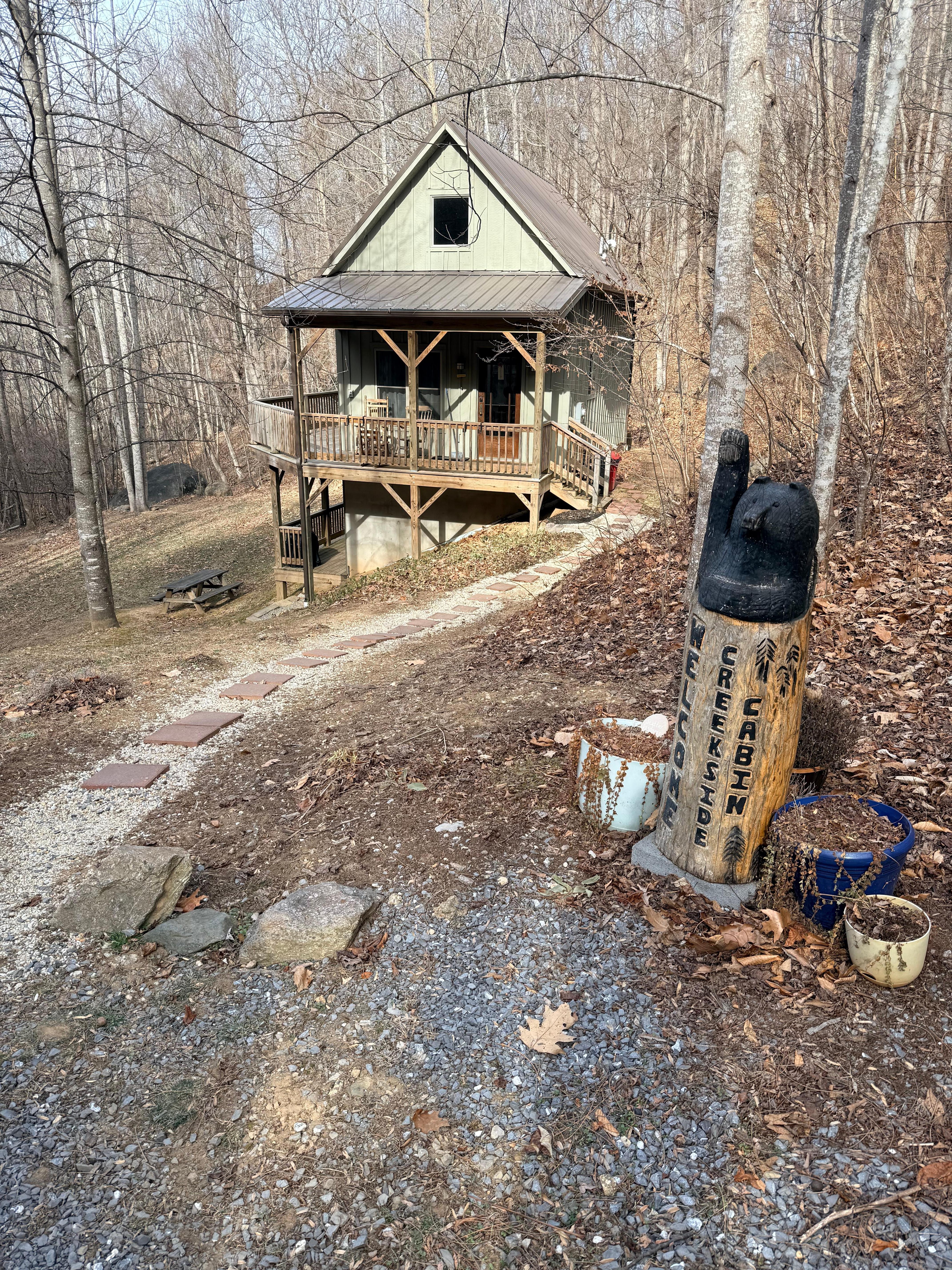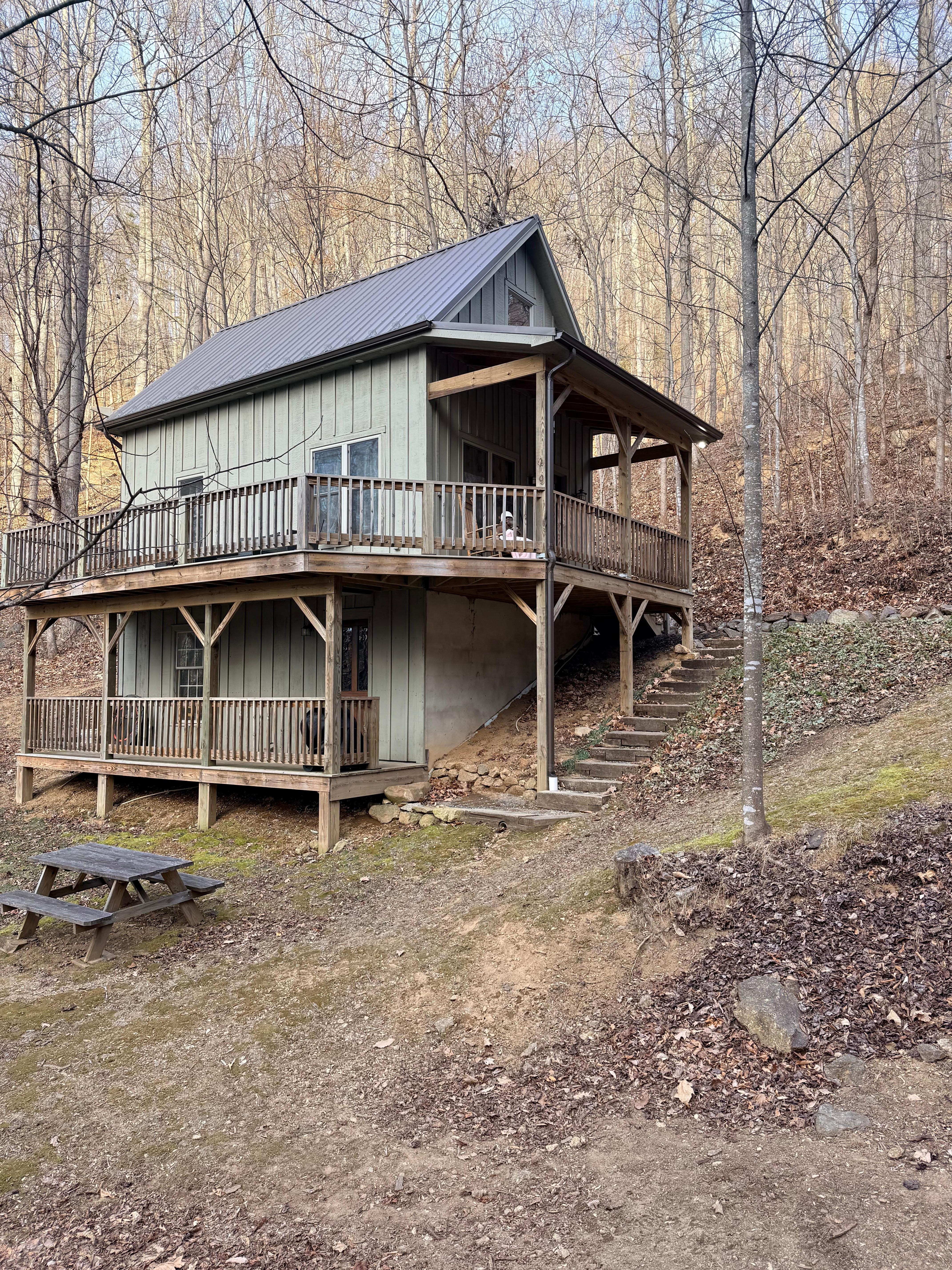 Our cabin is on the side of the mountain with some steep terrain and lots of natural elements outside to discover. The creek is a fun place to splash and explore.