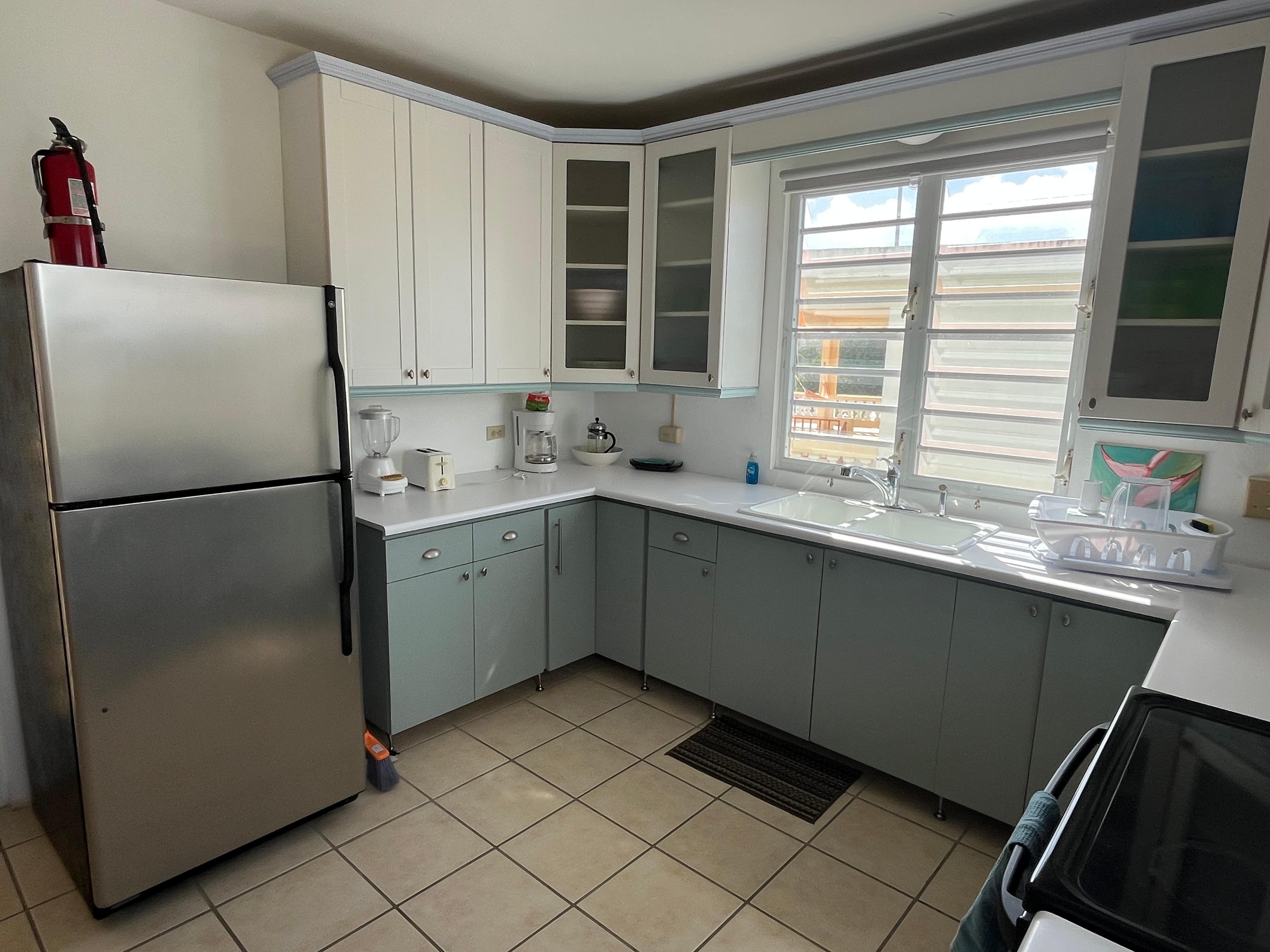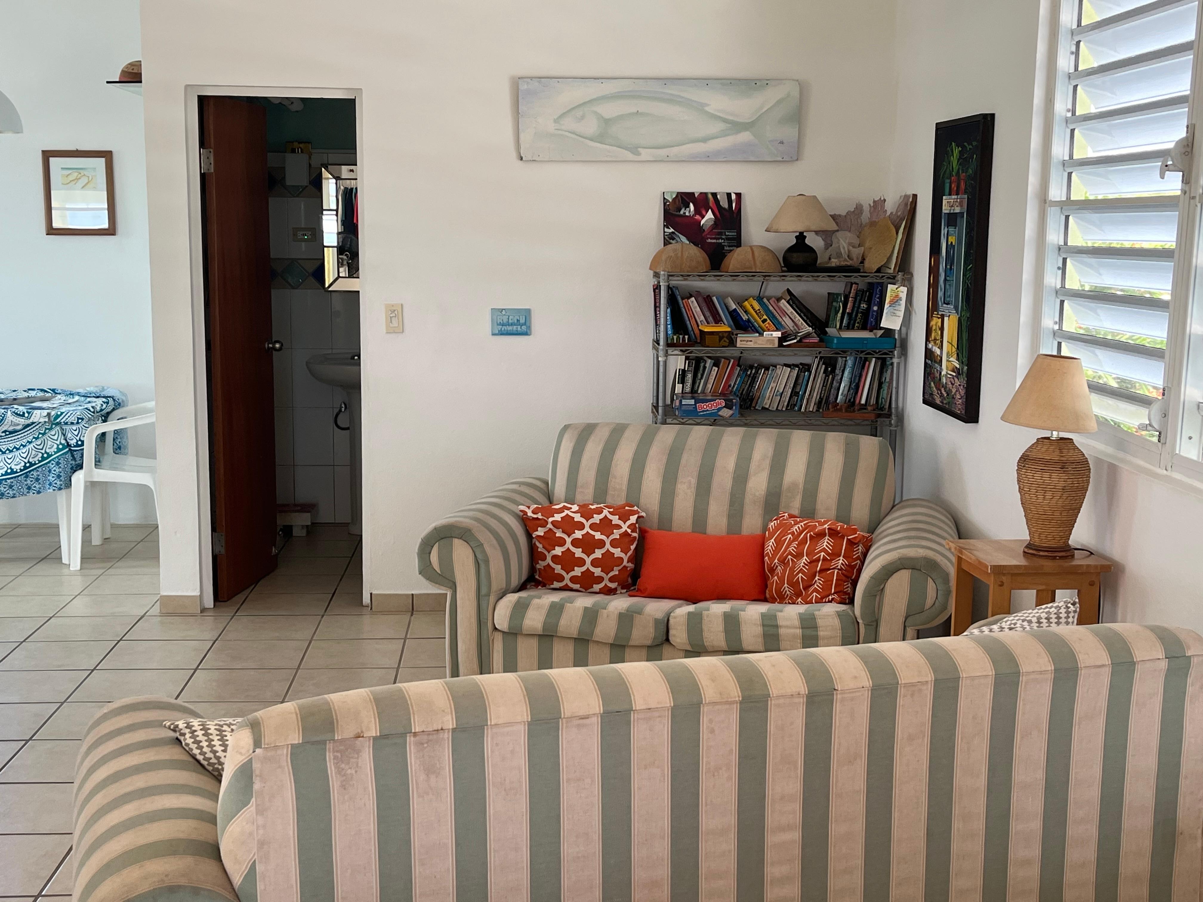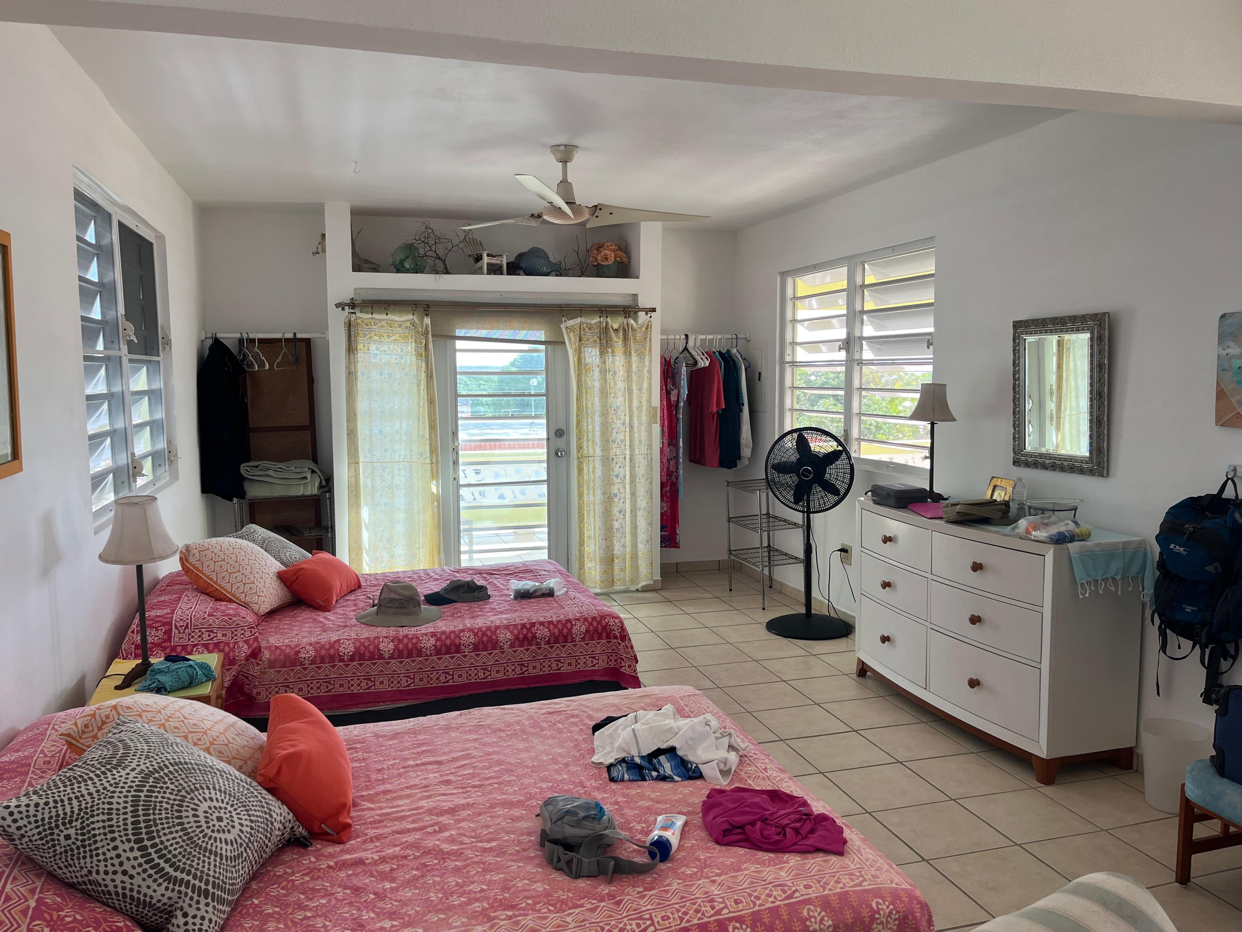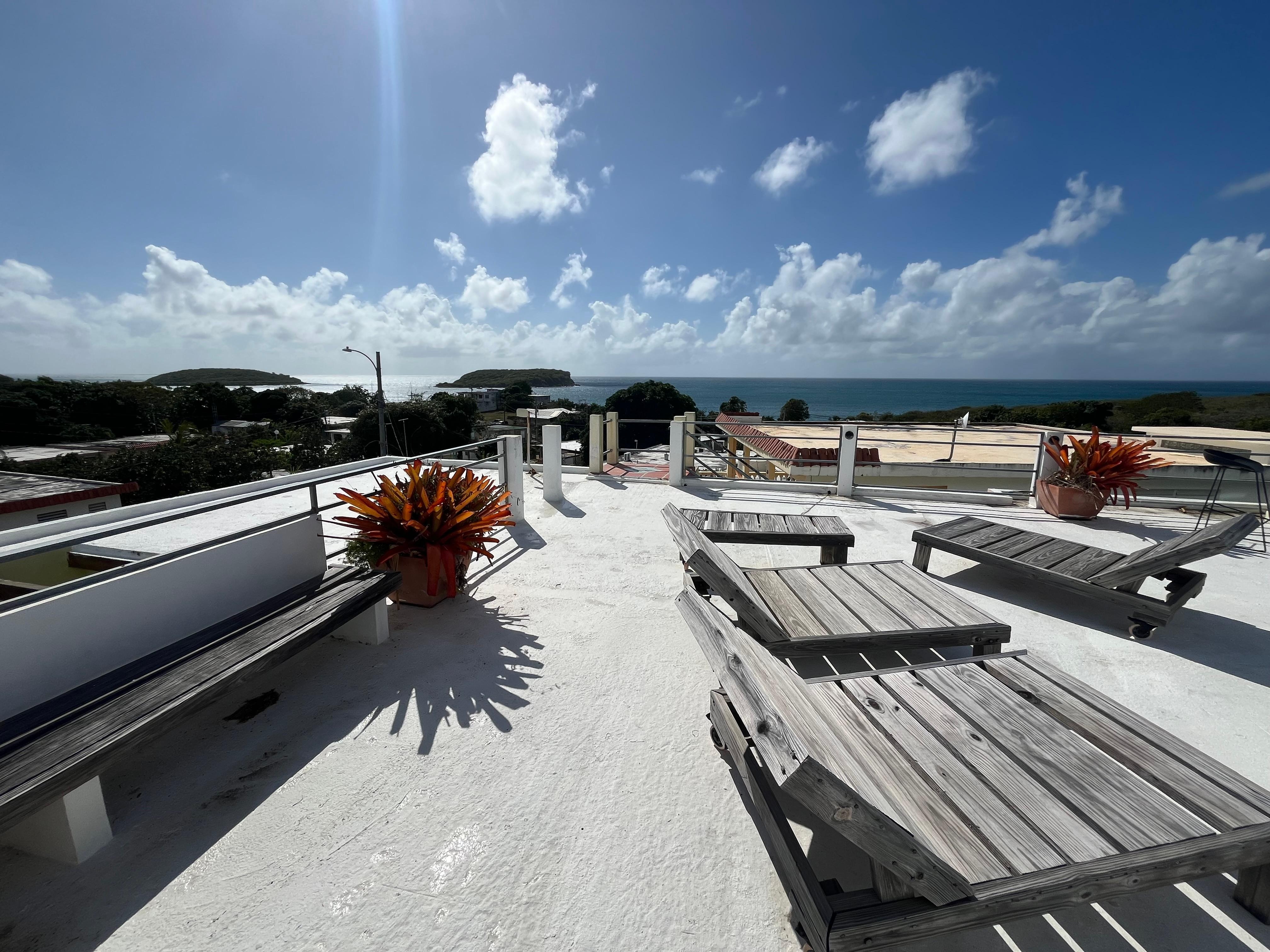 Dette lyse og luftige studioet har en stor, møblert terrasse med utsikt over strandlinjen til Esperanza. Hele andre etasje er ditt private paradis! Massevis av komfortabelt møblerte uteoppholdsareal, inkludert spisebord og stoler, drømmende Papa-san-stol, polstret sofa og lenestoler på terrassen. Inni kan du slappe av på to sofaer, to komfortable dobbeltsenger og nyte et velutstyrt kjøkken. Denne nydelige Studio-leiligheten har alt du trenger, inkludert en blender for de tropiske drikkene! Lytt til Coqui i vår frodige tropiske hage. Da solen begynner å gå ned, kan du slappe av på takterrassen vår! Dette er den beste solnedgangen i Vieques! Taket har 360 graders utsikt over det karibiske hav og fjell! Spesialdesignede og bygde møbler og en bar med vask gjør denne takplaten til den ultimate når du bor i paradis.