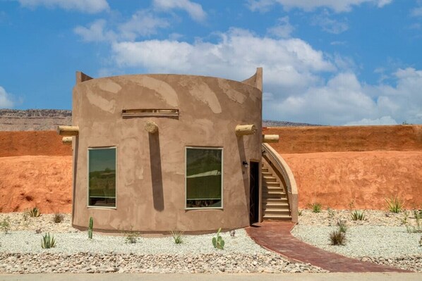 This Cliff Dwelling has 2 Queen beds and an indoor bathroom with a shower, flushing toilet and a sink. Also inside the Kiva is a kitchenette with a small refrigerator, a sink, a dishwasher, a microwave and a Keurig coffee maker. We provide plates, cups, bowls and silverware. There is an open rooftop space that has a fire table and chairs, a gas BBQ grill and a hot tub.