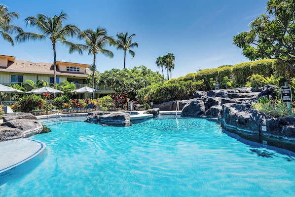 The Waikoloa Beach Villas are a gated condominium community in the heart of the Waikoloa Beach Resort on the Kohala Coast of the Big Island of Hawaii. Centrally located across from the Waikoloa Queens Marketplace, Island Gourmet Market and Kings Shops for great shopping and excellent dining. Anaehoomalu Bay Beach is a short 15 minute walk or a few minutes’ drive from the Waikoloa Beach Villas.