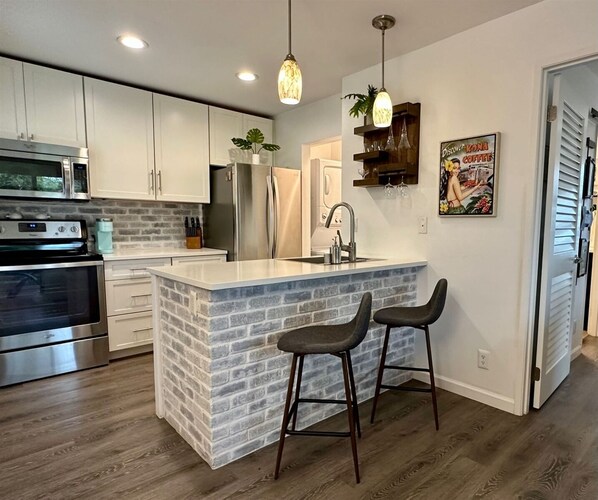 The washer/dryer are conveniently located off the kitchen, there are Tommy Bahama beach chairs, boogie board and a sun umbrella. The unit has an iron and ironing board plus ample closet space. This is a gated condo complex, one assigned parking space. This condo is located on the second floor, with about 20 stairs going up. Complex has a pool, jacuzzi and a lovely barbeque area. Just minutes away from some of the most beautiful beaches on the island.