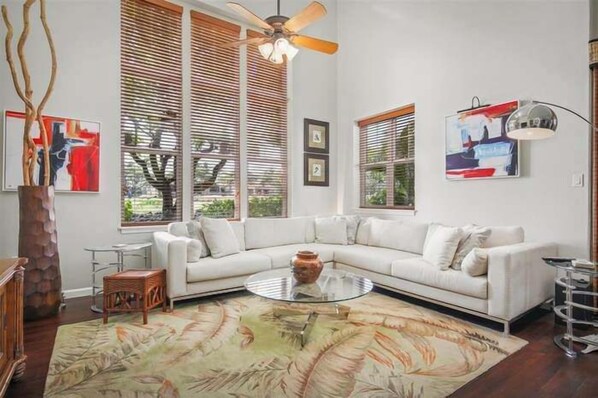 Introducing our Hawaii Golf Course Oasis Paradise Villa, the epitome of luxury and relaxation. Set amidst lush greenery and overlooking a stunning golf course, this villa offers a truly serene and picturesque setting for your vacation. This stunning 3-bedroom, 2.5-bath Townhome style condo is a true oasis, with 17ft ceilings, the villa boasts all bedrooms located upstairs, ensuring privacy and tranquility. The Primary Bedroom Suite is a true haven, featuring a Private Lanai that overlooks the picturesque Golf Course. Unwind in the soaking tub or pamper yourself at the double vanity sinks, creating a spa-like experience in the comfort of your own suite.