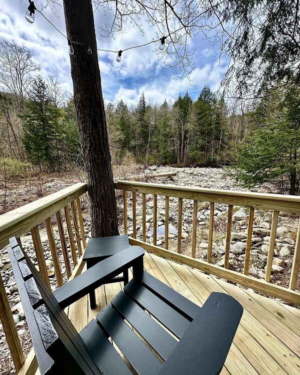 Our home has a beautiful fully fenced back yard and outdoor shower along the river bank. The yard is complete with a deck, grill, and firepit. Lounge in the Adirondack chairs and relax with the subtle sounds of the flowing brook nearby or enjoy great conversation and cocktails by the cozy firepit.