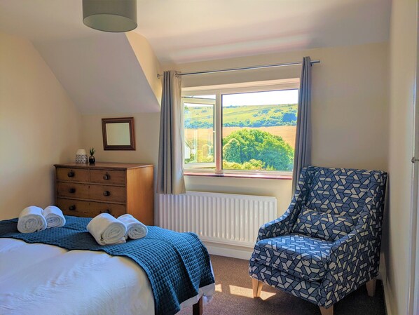 The master bedroom overlooks the front drive, and has beautiful views over the hills opposite, it provides built in wardrobes, a chest of draws and a comfy to chair to make getting changed a joy. This room has a king size bed fitted with a brand new mattress.