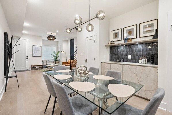 ★ TWO LIVING ROOMS & 2 KITCHENS ★ Each floor features its own open-plan living room and full kitchen: • Comfortable seating and Smart TVs • Kitchens fully equipped with stainless steel appliances, Keurig machine, cooking basics, and more • Dining area with seating for 6