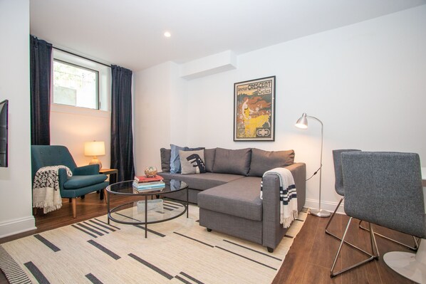 While it's a lower level, the space is warm, bright, quiet and roomy. Original doors and door hardware were preserved but the bathroom and kitchen are the epitome of new and nice. The living room is open and features high-speed internet, smart TV and a fold-out sofa bed. The entire unit features heat and central air conditioning too, and there is a full-size washer and dryer for your use.