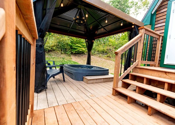 The space is a small cabin. There is a queen bed and a single bed in the loft upstairs.