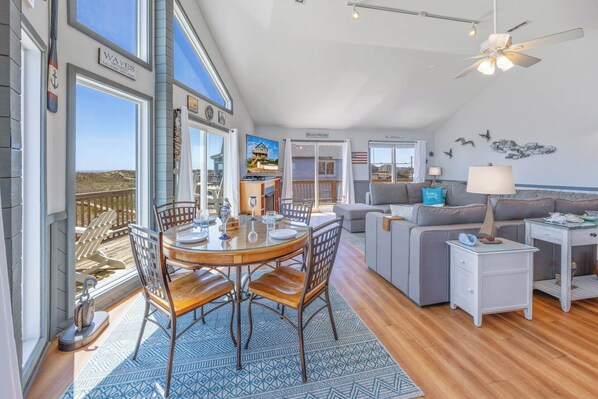 OCEANFRONT Waves - Sea Isle Hills. Ta med familien din til WHIMSEAGULL WAVES i år for en lekfull øyferie. Denne nydelige havnefronten hjemme ligger i en rolig blindvei, er innredet i sjarmerende strandinnredning. Det ekspansive bassengområdet gir rikelig med sitteplasser for gruppen din rundt det store betongbassenget og bassengkanten Tiki bar. Andre fasiliteter på bakkenivå for strand- og bassengdager inkluderer en fotvask rett utenfor bassengporten for å skylle av sanden, et cabana-halvt bad og utendørs dusj, og et vaskebord med vann og lys. Det første nivået av hjemmet tilbyr fire soverom for søte drømmer. En konge soverom med TV / DVD deler et bad med et soverom med 2 enkeltsenger. Begge har en glidebryter til havet dekk. En dronning soverom med flatskjerm-TV deler et bad med køyeseng soverom. Vasken er også på dette nivået. Det øverste nivået er hjemmet til en dronning soverom med hvelvet tak, flatskjerm-TV, vakker havutsikt og glidebryter til toppnivå dekk. Det romslige, store rommet har høyt hvelvet tak og vinduer som kommer til himmelen, hvorfra du kan se Carolina Blue Ocean Views. Sitteområdet omgir en stor flatskjerm-TV og gasspis peis, mens den nærliggende spiseplassen seter 10 ved spisebordet, en annen 4 ved et frokostbord og en annen 4 på kjøkkenet frokostbaren. Alle sitteplasser lar familien din spise med utsikt. Kjøkkenet har rikelig med diskplass og bekvemmeligheter for kokken i gruppen. Etter middag, gå ut på havet dekk eller ned til bassengområdet for en suge i boblende badestamp under stjernene.