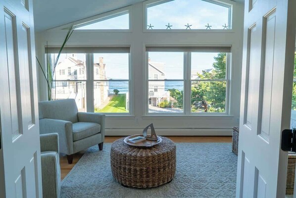 The Sand Wedge, including a lovely golf weather vane, pays tribute to a father who cherished both the game of golf and the beauty of the sea. The family wishes to share this special place, inviting people to create wonderful memories along this stunning stretch of shoreline. They’ve lovingly put every detail into making this home the perfect retreat for families or friends at the beautiful Moody Beach in Wells, Maine. Upon arriving at the home, you'll step into the wonderful garage and ground floor level! This area exhibits a delightful under-the-sea adventure for the kiddos, featuring a wave wall and fun hands on activities. It's spacious enough for family movie nights or playing board games. Off this bonus room, you'll find the first of four cozy bedrooms which includes two twin beds, a closet, and a convenient half bath. Plus, the washer and dryer, along with drying space, are conveniently located on this floor. The stairway leading up to the main level is a another charming tribute to Joe- known for his red socks on Sundays. Once you enter the main level, you'll find the second bedroom, the only one on this floor, tastefully decorated and offering two new twin beds along with an office space and plenty of room for your personal belongings. A full bath is positioned next to this bedroom, accessible for everyone on the main floor. The simple and tasteful decor encourages relaxation, making it a cozy spot to take a nap on a cloudy day or unwind away from the summer sun. The large dining area and table provide ample space to gather and enjoy meals with a crew. The fully equipped kitchen has everything you need to whip up a delightful seafood feast along with all the little extras. You will absolutely stepping out onto the spectacular wraparound deck, where there’s so much space to relax and soak in the ocean views and the moon rising in the evening. The stairs to the third floor lead to the primary suite, featuring a sitting area and a sliding door that opens to a deck with seating for two—a nice little hideaway! The spacious primary bathroom complementing this suite includes a full walk-in closet. The king-size bed provides comfort, allowing you to drift off while listening to the soothing sound of crashing waves—it's like a natural sound machine! This room is very bright (faces the east- sunrises) and may not allow for light sleepers to sleep in. The second and final bedroom includes two queen-size beds, a full closet, and a charming little area for getting ready.