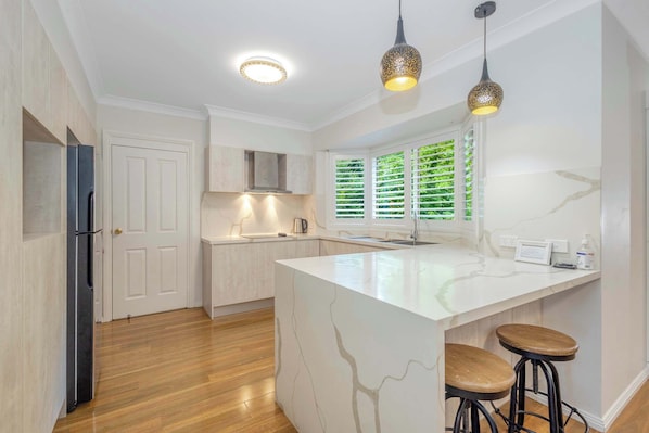 • Fully equipped with electric cooktop, oven, fridge/freezer, dishwasher, microwave, kettle & toaster