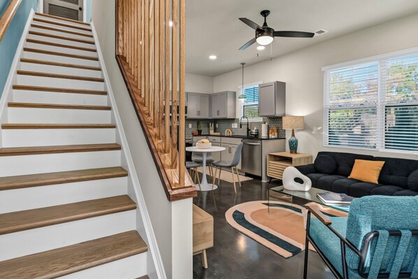 In-unit laundry: A stacked washer and dryer are conveniently included and located upstairs. Laundry pods provided with Tide Free and Clear detergent.