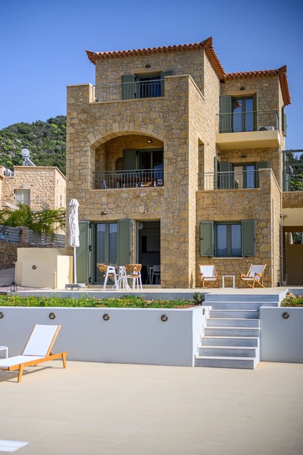 Lithos is our stunning apartment located on the ground floor of our beautiful complex overlooking the picturesque Kardamyli Harbor. It can accommodate 2-4 people and is perfect for couples, families or small groups of friends looking for a luxurious holiday experience.