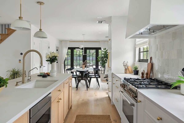 Kitchen: A full chefs kitchen with a 10' Caesar Stone Island and integrated appliances including a 36" Bertazzoni gas range. Designer European kitchen cabinets equipped with brass finished hardware. Featuring everything you'd need for even the most intricate of meals, appliances include a blender, combination toaster oven and air fryer, ice maker, Keurig coffee maker, and Italian expresso maker. A bar station with mixology books are available for you to try your hand at bartending. Complimentary K-cups, a dual rollout spice rack, dishwasher pods, dish soap, and garbage bags are provided.