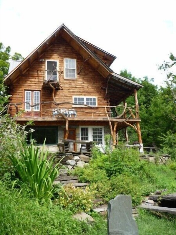 ARTISTISK LOGGHAVN, privat og fredelig. Sett inn i et perfekt hjemsted med frukttrær, bær, hager og naturlig terrasserte terreng. Med skog og gamle beitemarker rundt, vil fuglene hevde morgensoloppgangen. Vakker utsikt fra de mange vinduene og verandaen rundt to sider av huset; også en stor skifer terrasse som er perfekt for matlaging. Fullt utstyrt kjøkken med oppvaskmaskin, mikrobølgeovn og to ovner. Hytta har plass til opptil 8 personer, hovedsoverom med eget bad, andre soverommet har en dobbeltseng, en enkeltseng og en annen singel på hems (som barna ELSKER). Det tredje soverommet har en dobbeltseng. Det fjerde soverommet har en dobbeltseng og en enkeltseng. Solrommet har to sofaer som dobler seg som senger. Soverommene og to bad er ovenpå, ett bad er i første etasje. Hytta er eier bygget av stort sett gjenbrukte eller lokale materialer som finnes i omliggende skog. Hvert bad er et unikt kunstverk, og du har aldri sett en peis som denne! Hytta er ment å være et eksempel på hvordan et vakkert, komfortabelt og funksjonelt hus kan bygges for en brøkdel av kostnadene ved å bruke fantasien. $ 180 per natt, minimum 2 natt basert på opptil 4 gjester, ekstra gjest $ 35 hver per natt.