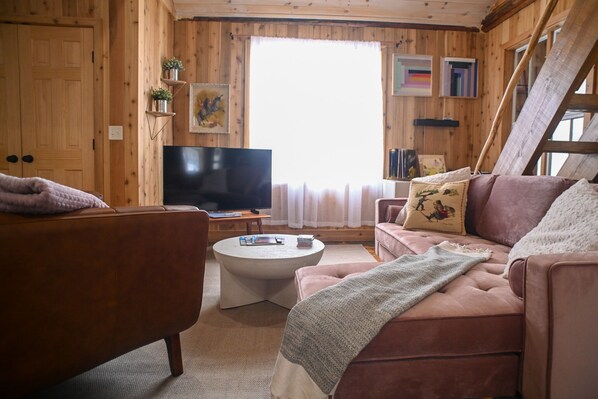 A really lovely space for a relaxing stay. Mostly a large open room with one open loft bedroom and another bedroom that is very private. This worked out well for us because we were traveling with our 20 year old daughter and her boyfriend and they wanted privacy while we just wanted to hang out. My only heads up is that the stairs to the loft bedroom were a bit treacherous. I'm in my 50s and got a good workout from them but if you have any problems with climbing or heights or if you have little kids I would pass. The area is very rural though there are houses within sight. The roads are right there but there's very little traffic, some ATVs. One weekday night one of the neighbors mowed his lawn for hours but otherwise, very quiet. The local town is also very low key. We were there in July but I'm sure it's very busy in the winter because of the proximity of Jay Peak. Just a lovely space.
