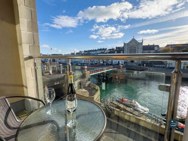 Townbridge Retreat is a centrally located two bedroom apartment situated along the bustling waterfront, overlooking Weymouth's historic town bridge. The apartment is bright and welcoming, flooded with natural light from the glass balcony doors which frame the stunning coastal view. The living space is open plan, with the living, kitchen and dining area all in one. Through the hallway are two bedrooms; A double en-suite and a twin, along with a family bathroom. There is private parking in the ground floor parking area for one car. Access to the apartment is via a three flights of stairs or via the lift.