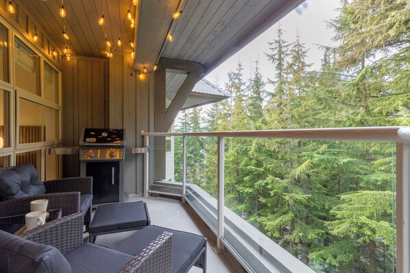 - Private patio with outdoor furniture, BBQ grill and fun festoon lighting