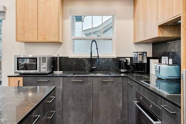 Kitchen has large center island, 3 bar stools, under counter lighting and full size appliances. The kitchen has all our basic cooking needs, just bring groceries.