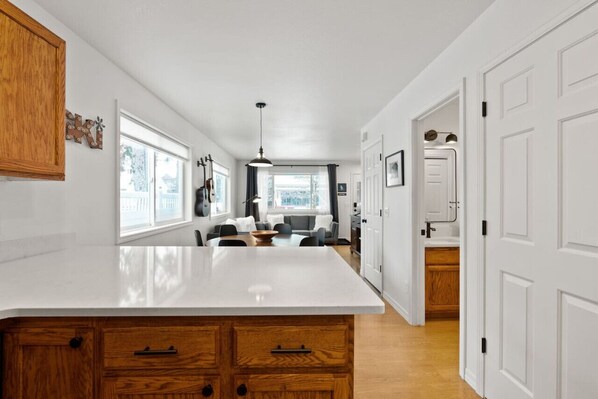 The two bedrooms and full bath are conveniently located upstairs with king beds and ample storage provided in both rooms. Need an extra bed? We can provide a twin rollaway bed for use should the need arise.