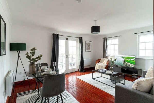 - Dining table, cosy sofa, armchair, and Smart TV