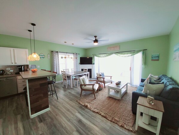 Our 3 bedroom, 2 bathroom condo has it all! Featuring two outside decks for morning coffee and reading, a fireplace, a full kitchen, dishwasher, central A/C, gas heat, NEST thermostat, a large washer and dryer (laundry detergent & fabric softener provided), WIFI, and four smart TVs. A garage with two parking spots as well as an outside space allows for 3 vehicles. With Beach Creek Oyster Bar a block away and Mud Hen Brewery and Kona Surf Shop also a short walk away, there is always something to do. The pool, Jacuzzi, and grill can be accessed through the garage for privacy.