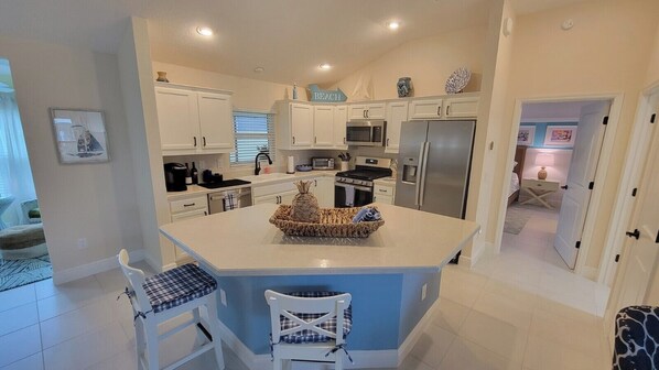 We had a wonderful time for our first visit to the Villages! This home is beautiful! It has all of the necessities to make it feel like home. A few highlights: *Lovely decor *King bed- comfortable *Coffee pot with coffee and creamer provided *Extremely clean *Great golf cart included- absolutely necessary for the full Villages experience *Kitchen has pans, toaster, utensils, mugs, dishwash supplies, trash bags, basically all of the small things that a traveler needs and rentals seldom have. This was so thoughtful! *Great wifi *We would return in a heartbeat!