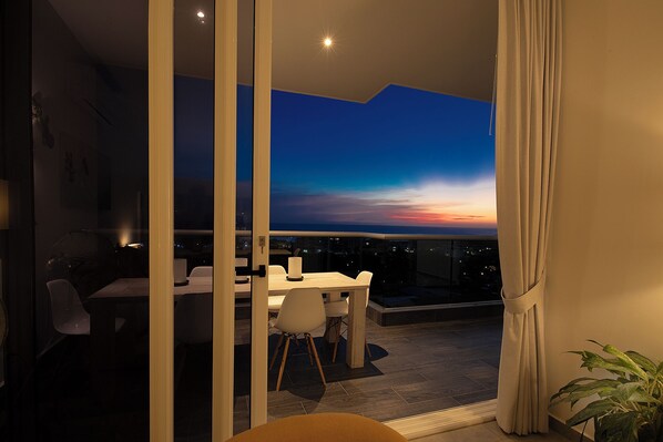The entire apartment features high ceilings with large sliding doors. Opening these connects the indoor spaces to the outdoor area, offering breathtaking views of the Caribbean Sea.