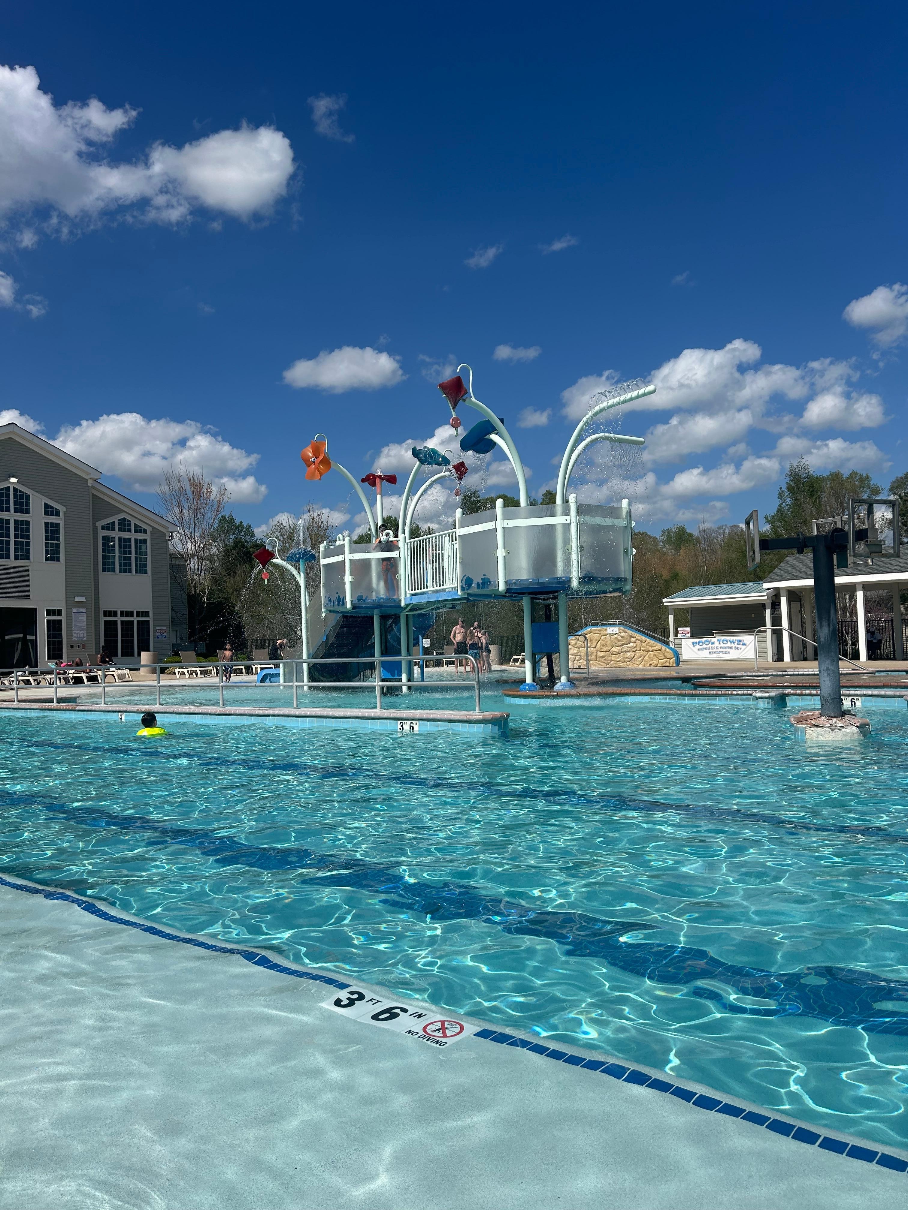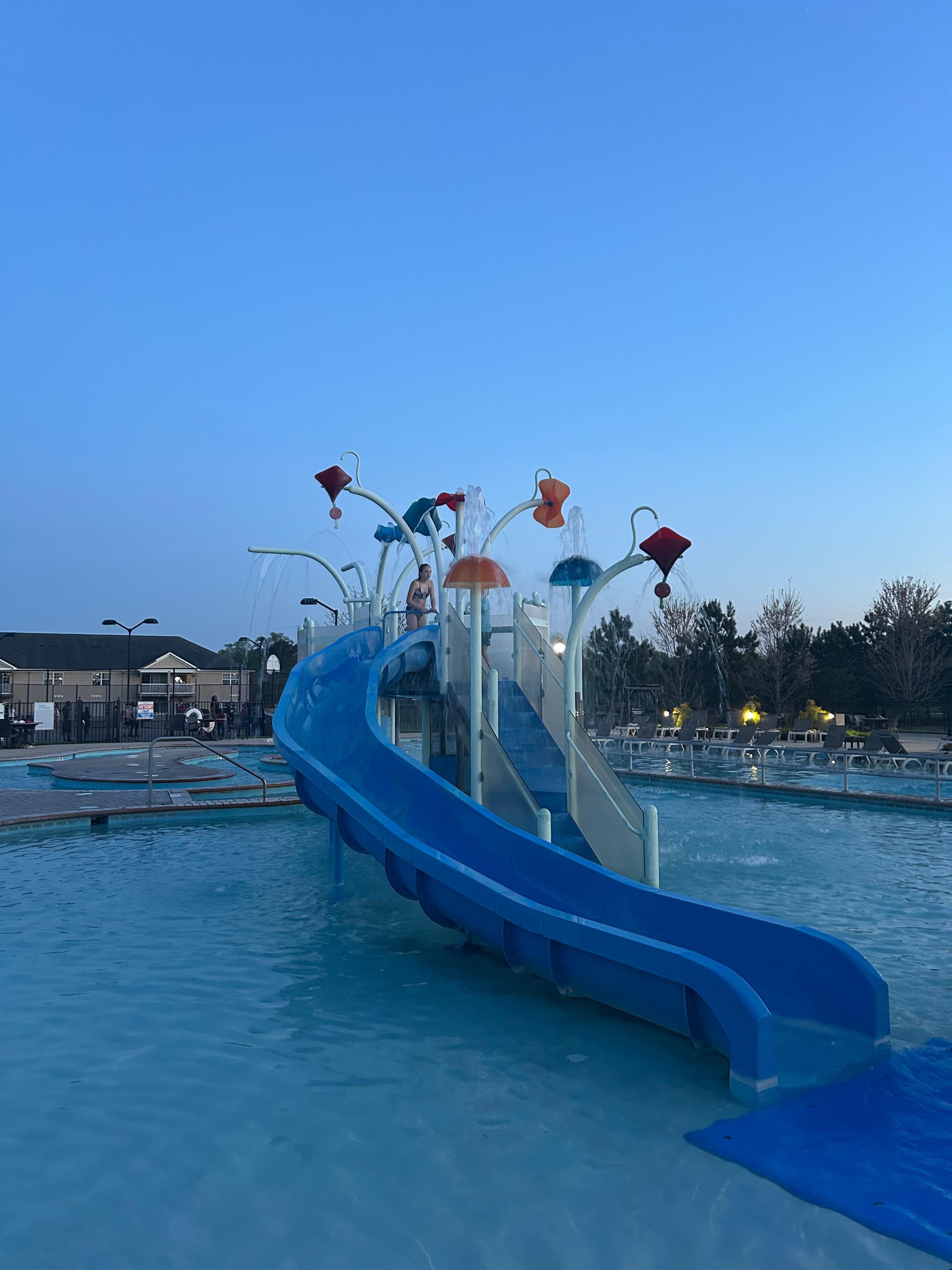 Sesongbasert utendørsbasseng og innendørsbasseng med elvebane, vannsklie og solsenger