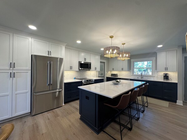 This newly renovated house in Wilmington, NC is within 5 minutes of Wrightsville Beach, UNCW, The Cross City Trail, Mayfaire Shopping Center and ILM Airport is a 10 minute drive, downtown Wilmington just 15 minutes. Enjoy a brand new custom kitchen fully stocked with all you should need to cook at home. This home offers 3 cozy bedrooms - 2 with king beds and a 3rd bedroom with a twin over double bunk and a separate twin bed. The master en-suite bath has a walk in shower and the guest bath has a double vanity with tub/shower combo. With amenities like a fully fenced yard, deck and patio, front covered porch and ample parking, guests will feel right at home. Restaurants, shopping, entertainment, beach, biking and walking trails are all a few short minutes away. Relax in this beautiful space after a day of exploring the city, enjoying the beach or biking miles of trails on the Cross City Trail located just down the road. This is also the perfect place for parents to visit students attending UNCW, just around the corner. Want to bring your boat or RV, no problem, there's plenty of parking in our driveway! Take a stroll in beautiful Autumn Hall, located just behind our home. Coffee shops and breakfast spots are so close! You could not be anymore conveniently located while visiting Wilmington, NC!