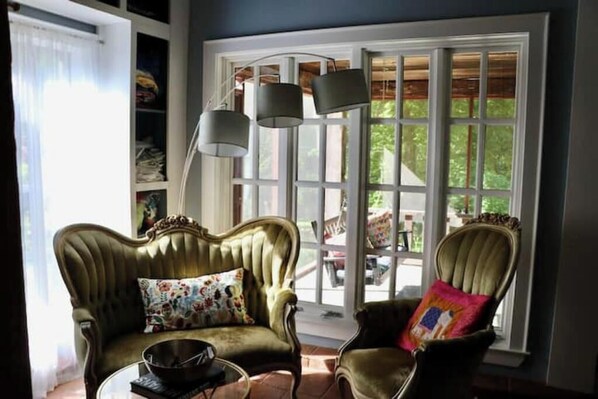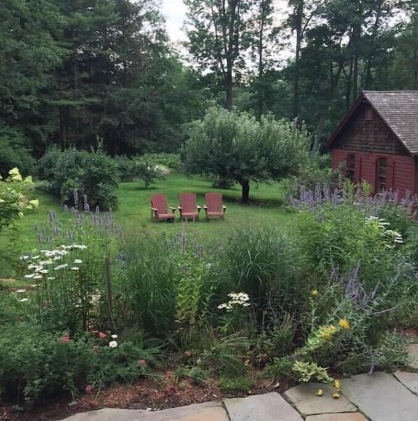 This is a magical room with large old granite stones making up one wall and a bank of windows making up another. The french door opens to a large screened-in porch which overlooks a waterfall. With an antique four poster canopy bed and a tile floor with Turkish rug, you are sure to want to relax here. But nature is calling and you will also be inclined to wander along the water fall or out into the pavilion, gardens and orchard. Its a perfect place to just breathe. Please note that two cats and one dog live in this house (NOT in this room!)