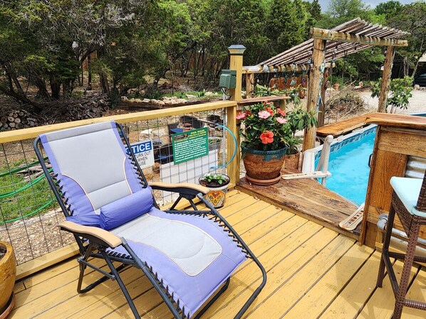 Home on the Range er et bortgjemt stykke av Hill Country-paradiset. Denne nyere ADA-kompatible, 1150 kvadratmeter høye toppen perlen har et badestamp, stort dekk, California-king-minne-skumadrass samt en dobbelt størrelse futon, stor dusj, datamaskin og skriver, WiFi, storskjerm amazon brannstokk-TV , DVD-spiller, fullt utstyrt kjøkken, vaskemaskin og tørketrommel, sentralvarme og klimaanlegg. Regnvann som samles inn på stedet forsyner 100% vann. Et fire øverste spisebord gir plass til en intim middag, med en forlengelse for opptil 6, nydelige doble glassdører etset med Star of Texas. Den generøse verandaen har et fire topp bord, propangrill og privat badestamp.
