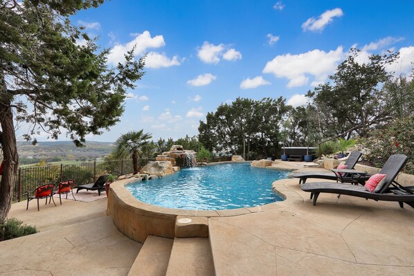 Og husk at Whispering Ridge har en bakgård å dø for; med et nydesignet Grotto-svømmebasseng som garantert vil være en favoritt blant alle gjestene dine. Med en vakker fallende foss som gradvis blir dypt, er det som om du vasser inn i ditt eget private hav. Og med en så stor hage som den, er det fortsatt god plass til et spill med fotball eller en spennende volleyballkamp. Har du frysningen? Eller kanskje det volleyballspillet etterlot deg litt sår? Se for deg å ta ibløtende luksuriøse, luksuriøse, store badestamp, komplett med dampende foss og vanntette musikkhøyttalere.