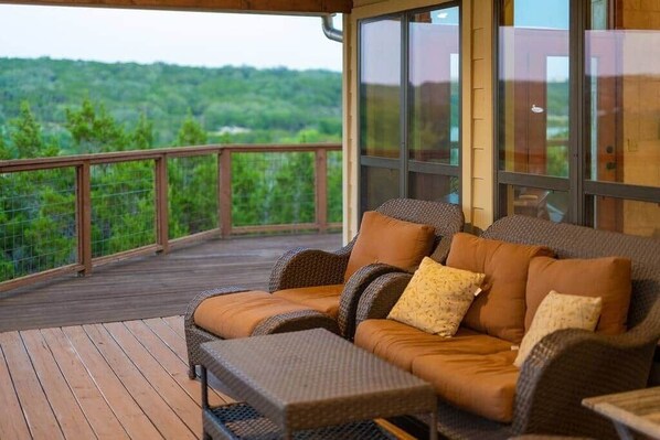 One of the most cherished features of The Star House is the expansive wrap-around deck, which offers sweeping views of the hills and the valley below. This outdoor living space includes a propane grill, a dining table for al fresco meals, and several places to relax—loungers for sunbathing, comfortable patio seating for morning coffee or evening cocktails, and even a hammock perfect for slow afternoons in the breeze. Wildlife often wanders through the surrounding acreage, and the peaceful environment makes it easy to unwind, stargaze, and enjoy the beauty of the Hill Country.