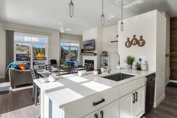 The fully equipped kitchen is a chef's dream, complete with modern appliances including a refrigerator, stove/oven, dishwasher, microwave, and a variety of cooking essentials. Whether you're preparing a quick breakfast or a gourmet dinner, you'll find everything you need at your fingertips.