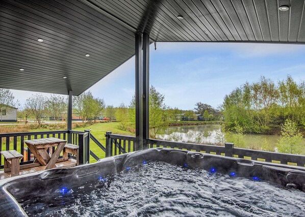 New in 2018. Modern and luxurious lodge with lakeside view. One master king-size double with walk in wardrobe and en suite with freestanding bath, his and hers sinks and inset TV. One twin (double by arrangement). Large shower room with walk in shower. Spacious lounge/kitchen/dining area with bi-fold doors leading out to enclosed and covered decking area with outdoor hot tub and brick built barbecue. Utility room with storage space. Adjacent parking. No pets.