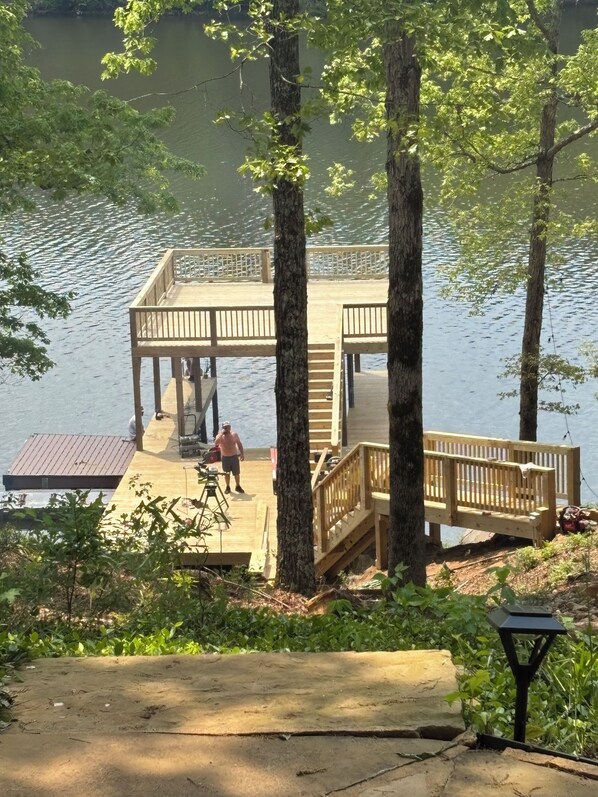 The terrace level offers a large porch with a gas grill and a storage box with life vests. You will love the view of the lake with a gradual descent of the stone steps/path to a beautiful stone patio featuring a fire pit for roasting marshmallows, etc. There are also a few steps leading to the new super, large dock with a second level area.