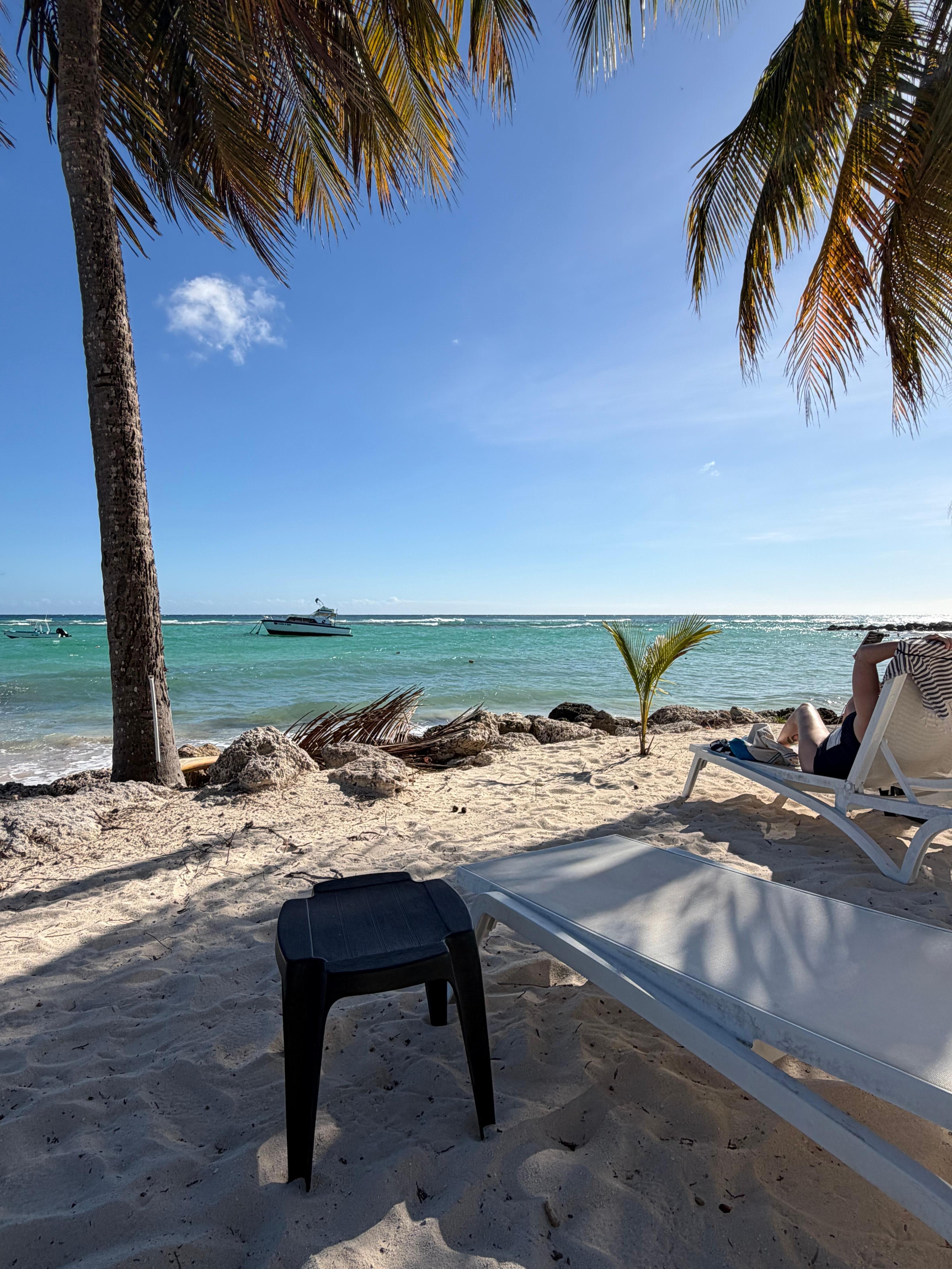 The room was extremely clean with up to date amenities. Karen, Andre, and Simon all made us feel so welcome. They helped with everything possible, from reservations for dining, to getting us to the cruise terminal. We couldn't have asked for more. The location for this hotel is superb. It is close to everything and you are in a prime beach location with lovely sunny views, palm trees, "icing sugar"fine sand. We got in the water and had a swim. There are beach bars near by that serve great food and nice rum drinks. There are also highly rated places for fine dining within walking distance. Everything was lovely. We highly recommend this hotel for all the above reasons and we hope to be back again soon!!