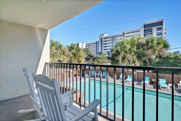 Hey, beach bums and wave riders! Chill out in your coastal escape, where the relaxed beach vibe flows into modern comfort. Located on the first floor with a private balcony overlooking the saltwater pool, this spot is perfect for unwinding after a day in the sun.