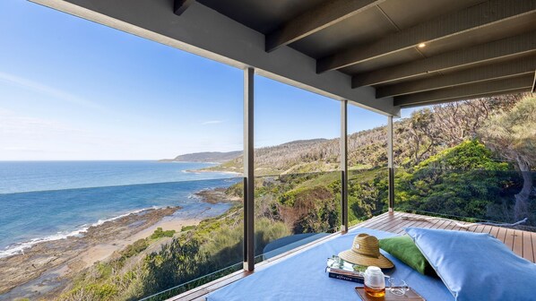 The space is lovingly curated with a distinctly Australian feel that will surely delight guests with an eye for art and design. Featuring a number of original artworks by contemporary indigenous and non -indigenous Australian artists, the space has a homely and contemporary feel with a nod to mid-century modern design. The open plan living, kitchen and dining areas all offer spectacular ocean and coastline views. Curl up on the couch looking out to the views, bask in the warmth of the centrally located wood fireplace with your favourite book or watch Netflix on the wall mounted smart TV.