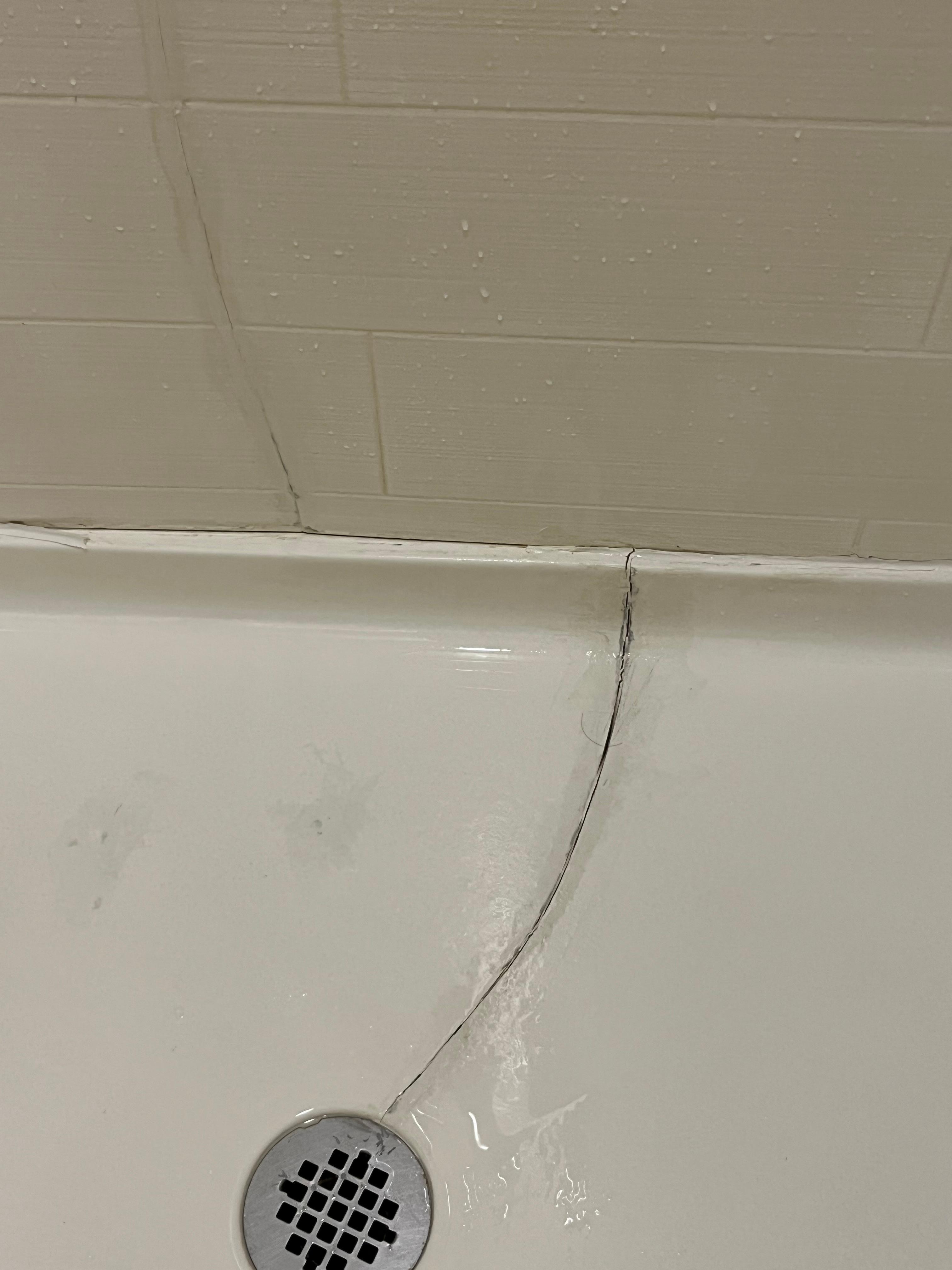 bathroom, shower floor had a huge crack in it, and it ran all the way up the side of the wall. Carpeting in front of the air conditioning unit was soaking wet. I don’t know if it was from the leak under the shower or from the air-conditioning unit itself.