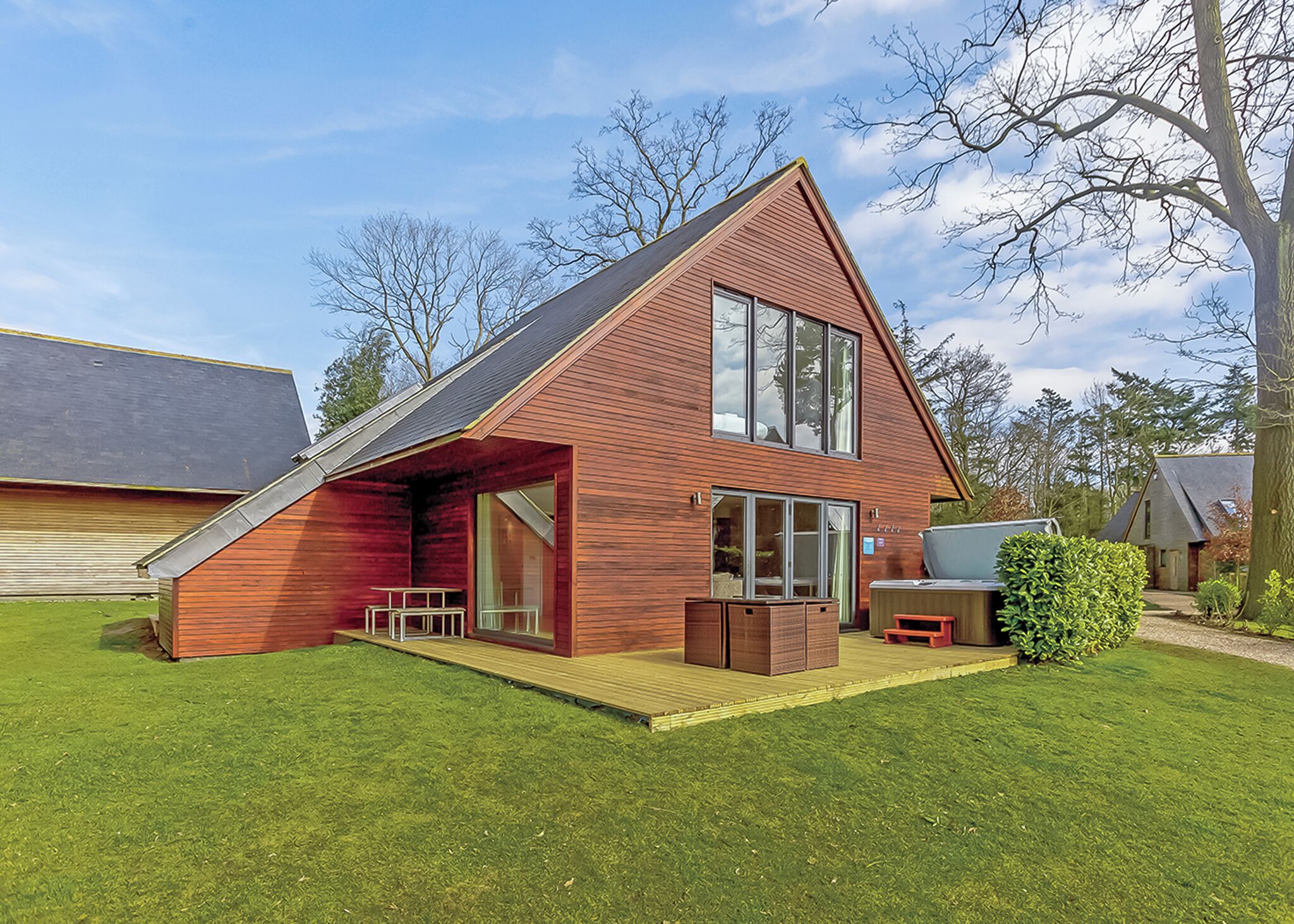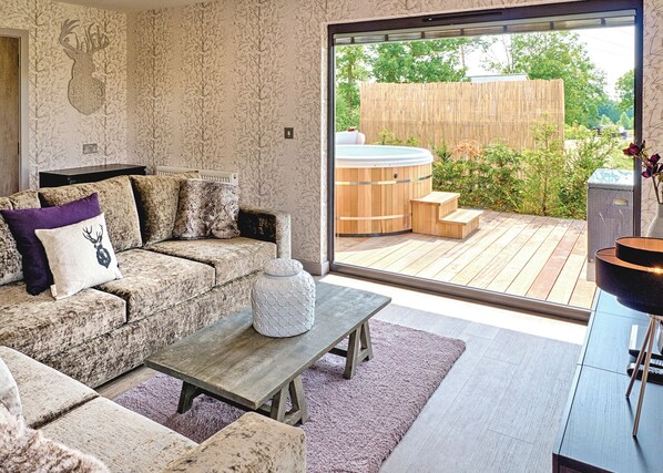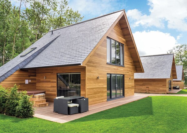 Luxury, ultra-modern two storey lodge with exquisite interior design with spacious living space ideal for family and friends. Ground floor: One light, airy double or twin (please check when booking), stylish bath and/or shower. Spacious, light, stylish open-plan living area with comfortable sofas looking out on decking and Flatscreen TV, glossy super stylish kitchen and dining area. Patio doors lead onto the large decking great for enjoying your morning coffee and relaxing in your own hot tub. On the first floor is the master king-size with picture windows, en suite with stylish bath and/or shower and one king-size double or one twin with en suite bath and/or shower. Pets allowed in selected accommodation only.