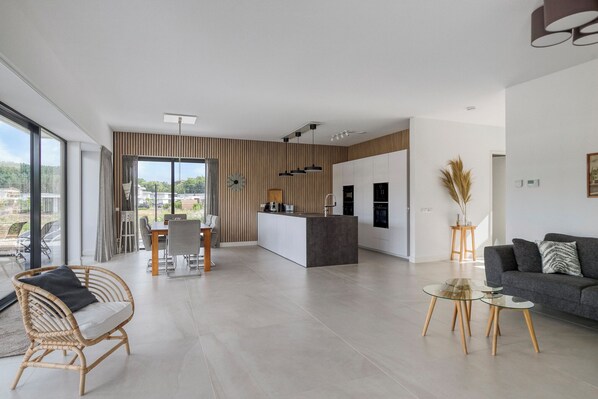 Stylish detached 6-person villa with private sauna, three en-suite bathrooms and private dock on the water