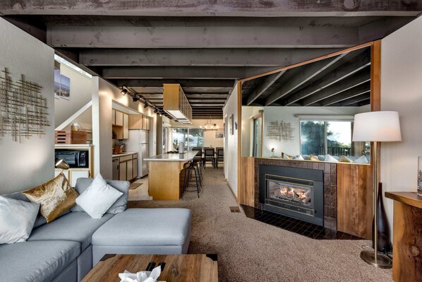 * Living room with a beautiful view, a gas fireplace, and TV with Roku