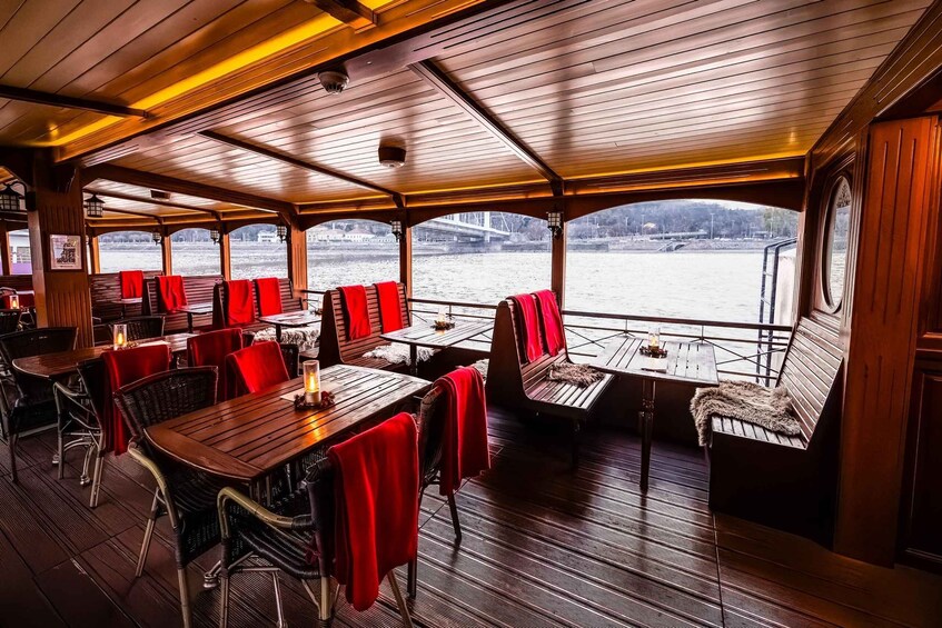 Du går om bord på ett av to unike historiske skip: Kisfaludy Paddle Steamer eller Hableány Paddle Steamer. Begge skipene er tro kopier av 1800-tallets hjuldampere, søsterskip med lignende design og historisk betydning, og tilbyr den samme panoramiske sightseeingopplevelsen mens de cruiser forbi Budapests mest ikoniske landemerker.