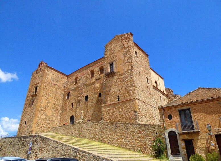 Turen fortsetter med et besøk til slottet som ble bygget av adelsfamilien Ventimiglia på 1300-tallet, med arkitektoniske elementer fra ulike stilarter som arabisk, normannisk og schwabisk, som sameksisterer harmonisk i en struktur med en ringmur som ble åpnet fra porten Porta Sant'Anna. Inne i slottet ligger det vidunderlige Palatinkapellet Sant'Anna, som huser den hellige helgenens kranium på hovedalteret med en front i koraller, gull og perler, og hvor du kan beundre dyrebare stukkaturer på gullbakgrunn og dyrebare kjeruber i hvit marmor.