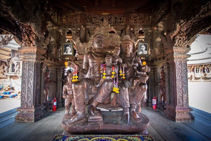 Sanctuary of Truth er helt i tre, og alle de delikate utskjæringene er utført for hånd. Her arbeider et stort antall treskjærere hver dag med å skjære ut de ulike figurene.